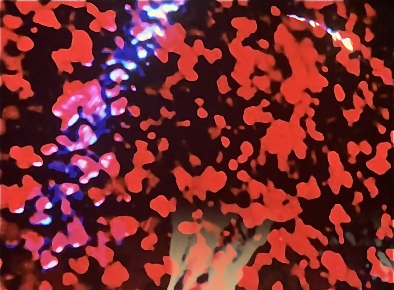 World Without End 3 - Childhood’s End envisions a child’s eye view of the world in shades of red and blue where painted abstraction alternates with found footage.